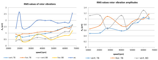 RMS values of rotor vibration from the first and second test. TB/DB—turbine/blower side, vert./hor.—vertical/horizontal direction.