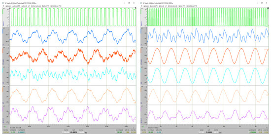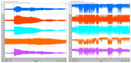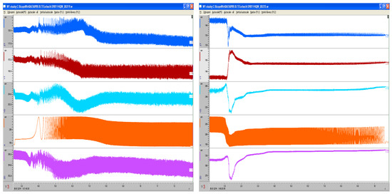 Relative rotor vibrations during tests were measured by means of eddy current sensors Micro-epsilon S04 (Micro-Epsilon Messtechnik, Ortenburg, Germany) connected to units Micro-epsilon eddyNCDT 3300 (Micro-Epsilon Messtechnik, Ortenburg, Germany) with resolution in nanometers and bandwidth up to 100 kHz. Vibration signals were recorded by National Instrument measuring USB DAQ card with 16 analog inputs and sampling frequency up to 1.2 MHz. The card operation was controlled by the program ScopeWin NI, enabling graphic processing of measured signals and statistic elaboration of measured data, e.g., evaluating RMS values of measured data or providing frequency spectra.