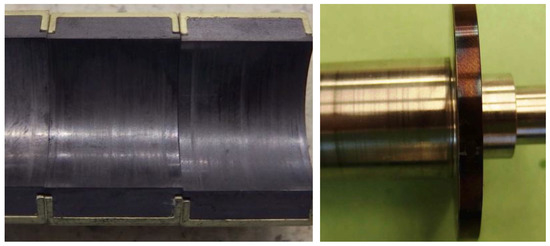 There are several patents covering bearing design [10,11], the simplest of which is illustrated in the left-hand section of Figure 1. Tilting pads 2 are supported by elastic members 4 with the shape-enabling free pad tilting in a peripheral direction. The detail of the pad elastic support is in the centre of Figure 1. The pad is held in position by the pin 3, which also enables the adjustment of basic bearing clearance by means of the nut 5. Basic bearing clearance, enabling easy run–up without excessive wear, is the most important advantage of TPJBs in comparison with foil bearings.