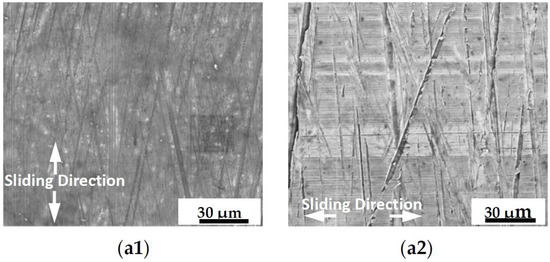 Figure 8 and Figure 9 depict the wear scar morphology of Cr and CrMoN/MoS2 coatings under different load conditions. From Figure 8, there is a slight furrow on the surface of the Cr plating of the piston ring due to the plough action of grinding, and some small and shallow scratches are on the cylinder liner surface. The wear mechanism of the Cr plated piston ring and cylinder liner is mainly abrasive wear (Figure 9a1,a2). The wear traces of abrasive wear on the piston ring and cylinder liner surface increase as the load increases (Figure 9b1,b2,c1,c2). The wear weight loss increases as the pressure in the contact surface increases. When the load increased to 400 N, there is serious abrasive wear and adhesive wear, caused by friction heat in the friction process. The wear mechanism of the piston ring transferred to abrasive wear and adhesive wear, as well as the cylinder liner.