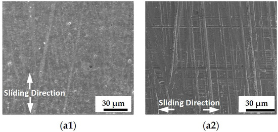 From Figure 9, it is known that the wear condition of the CrMoN/MoS2 friction pair is obviously better than Cr plating. There are only some slight furrows on the surface of the CrMoN/MoS2 piston ring at the load of 50 N, showing abrasive wear form (Figure 10a1,a2). The plough on the surface of the CrMoN/MoS2 piston ring and cylinder liner deepens as the load increases. When the load is 400 N, the wear mechanism is mainly abrasive wear, as well as some slight adhesive wear (Figure 10d1,d2). According to the transform film theory of self-lubricating composite coatings, a relative motion happened between two materials, and the adhesive wear caused by plastic deformation can exist under contact stress at high load, transferring from the piston surface to another surface easily, and thus forming a transfer film on the grinding surface after continuously reciprocating friction, adhesion and peeling.