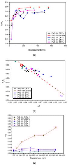 In Figure 2, the normalised pile-up/sink-in height hc/hm is plotted vs. displacement (a) and the H/E ratio (b). Rate-sensitive materials exhibit lower pile-up when compared with rate insensitive materials (due to strain hardening) [34]. This is in line with the fact that when hc/hm approaches unity for low H/E, the respective deformation is intimately dominated by pile-up (Figure 2d–g) [35,36]. However, when hc/hm approaches zero for higher H/E, this corresponds mainly to elastic deformation (dominated by sink-in) [37]. Higher stresses are related with higher H/E (hard materials); increased stress concentrations are developed towards the tip, whereas for low H/E (soft materials), the stresses are found lower and are distributed homogeneously at the cross-section of the material [38,39]. H/E is an index of resistance to wear; high H/E is indicative of the increased wear resistance in a range of materials [39,40]: ceramic, metallic and polymeric. In Figure 2, alter of H/E slope denotes the strengthening of composites with incorporation of 0.5% CNTs, whereas this ratio decreases with incorporation of 3 and 5% CNTs in the PVB matrix. Lower deviation of H/E values for 5% CNTs in the PVB matrix (PVBC5.0) implies good dispersion in the matrix, leading to almost stable behavior at resistance to wear (~100 to 350 nm displacement range). We can also observe in Figure 2b that while for the pure PVB, hc/hm is independent of the normalized hardness H/E, the addition of CNTs leads to a decrease of hc/hm for increasing H/E values; this is attributed to the switch from pile-up to sink-in deformation behaviour, after the addition of CNTs.