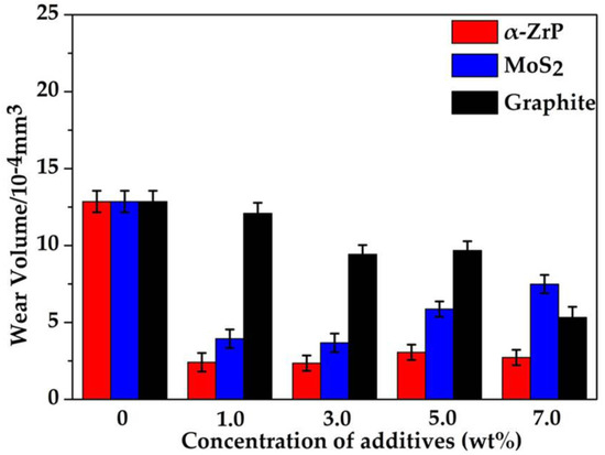 The wear volume losses of the steel discs as a function of concentration for anhydrous calcium greases with α-ZrP, MoS2, and graphite (SRV test, load 300 N, frequency 30 Hz, temperature 80 °C, duration 30 min).