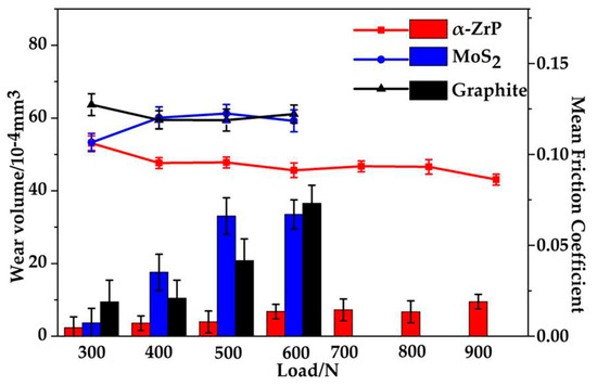 The wear volume (columns) and the mean friction coefficient (lines) for different applied loads for the grease with α-ZrP, MoS2, and graphite (SRV test, frequency 30 Hz, temperature 80 °C, duration 30 min).