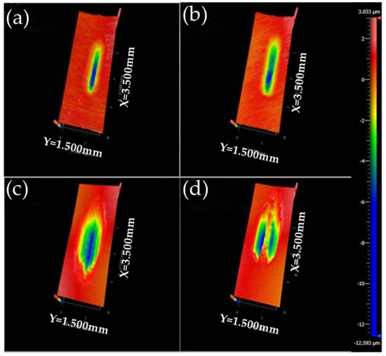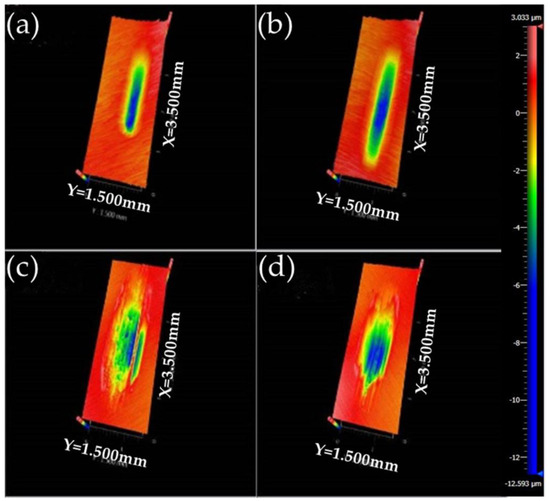 3D microscopic images of wear tracks on the lower disks: (a) α-ZrP at 600 N; (b) α-ZrP at 900 N; (c) MoS2 at 600 N; (d) graphite at 600 N (SRV test, frequency 30 Hz, temperature 80 °C, duration 30 min).