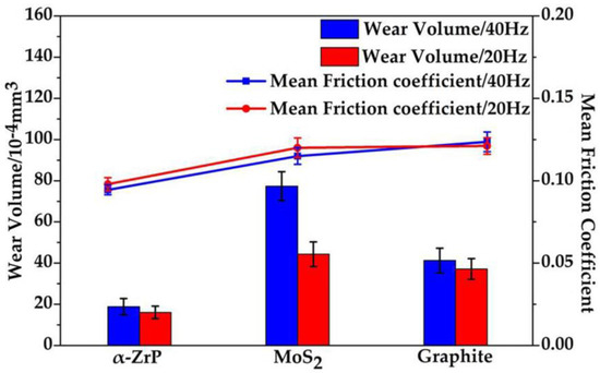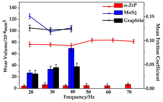 The wear volume (columns) and mean friction coefficient (lines) for different frequencies for the grease with α-ZrP, MoS2, and graphite (SRV test, load 600 N, temperature 80 °C, duration 30 min).