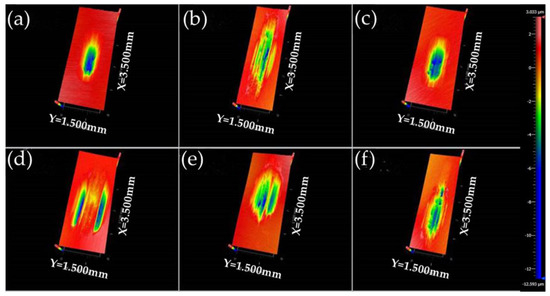 3D microscopic images of wear tracks on the lower disks: (a–c) α-ZrP, MoS2, graphite at 20 Hz; (d–f) α-ZrP, MoS2, graphite at 40 Hz (SRV test, load 600 N, temperature 80 °C, duration 360 min).