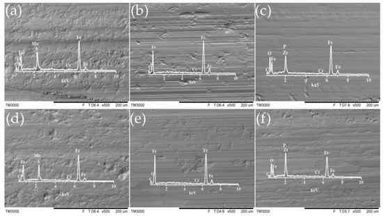 Scanning Electron Microscopy (SEM) images and Corresponding Energy Dispersive X-ray Spectroscopy (EDS) spectra of the worn surfaces on the lower disks: (a–c) α-ZrP, MoS2, graphite at 20 Hz; (d–f) α-ZrP, MoS2, graphite at 40 Hz (SRV test, load 600 N, temperature 80 °C, duration 360 min).
