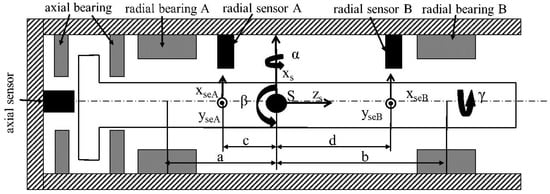 where is the equatorial moment of inertia, is the polar moment of inertia, m is the mass of the rotor, the entries of are the forces or torques of each degree of freedom and the entries of are the degrees of freedom according to Figure 1. Equation (2) describes the basic mechanical equation of a supported rotor. The system equation for different bearing structures lies in the calculation of the force vector . For the magnetic bearing, a dominant magnetic field can be assumed in many cases. The electromagnetic force can be calculated with: