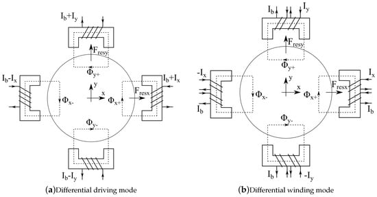 Because the magnetic force depends on , the forces at the pole areas can only pull the rotor. To overcome that problem, a bias flux is used. If a resulting force should act in a specified direction, the flux is increased in the pole area of this direction and decreased in the opposite using a control current or . Thus, a resulting force is generated in the requested direction, although every single force in the pole areas pulls on the rotor. Magnetic bearing structures using the differential driving mode have only one coil for each pole. The bias current and the control current or are superposed to the required coil current. Therefore, every degree of freedom requires two current controllers. For the differential winding mode, the bias flux is generated with separated coils. Therefore, the control flux can be created with only one current controller for every degree of freedom. In [,,], the bias flux is generated by permanent magnets. Such a magnetic bearing structure is called a permanent magnet biased active magnetic bearing (PMBAMB).