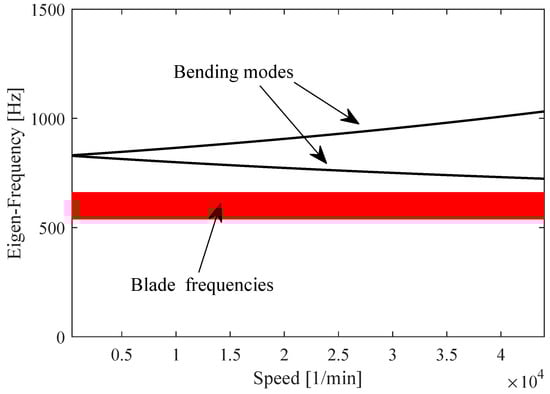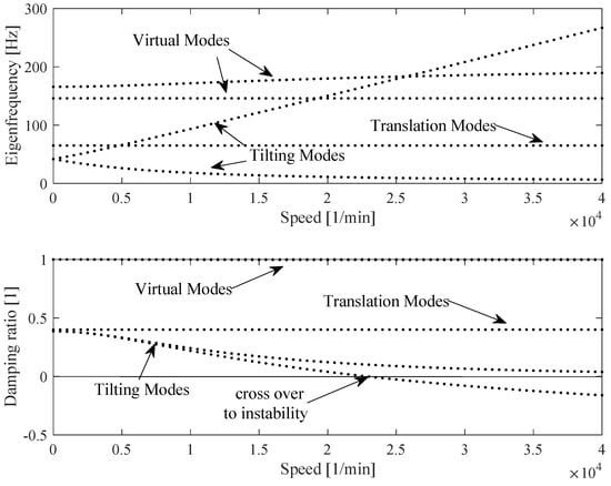 where and are the linearized negative bearing stiffnesses and and are the linearized force to current factors of the bearings. In Equation (2), only the rigid behavior of the rotor was considered. However, for many industrial applications, also the consideration of the flexible body modes is of great significance. In [], it was stated that the soft stiffness of magnetic bearings in many applications has a negligible impact on the eigen-frequencies of the flexible modes. Therefore, the flexible eigen-frequencies can be approximately found independent of the control structure. How the flexible body modes are stabilized by the phase shift of the controller is given in []. For structures where the stiffness of the magnetic bearing cannot be neglected, the finite element method in combination with the dynamic simulation of the control structure can be used. Finally, it can be stated that it is possible to stabilize the flexible rotor, if the natural frequencies are known for fixed bearing stiffnesses in the whole speed range. Figure 3 shows the flexible behavior of the investigated rotor.