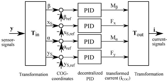 In some cases, the tilting and the translation movements are decoupled in Equation (8). In order to use the advantage of this decoupling for other rotor shapes, an input-output transformation is introduced. For this decoupled system, the controller design using the PID controller is a straightforward procedure at standstill.
