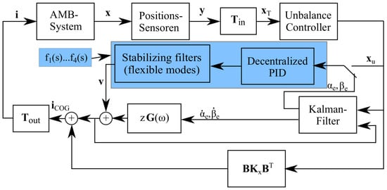 Magnetic bearings are used if an almost friction-less or wear-less operation is required. In this context, active magnetic bearings (AMBs) are used with increased regularity. In many applications of turbomolecular pumps, lubricant should be avoided. Therefore, active magnetic bearings are sometimes unavoidable for the rotor stabilization in this application field. The mechanical behavior of AMBs can be changed during operation. This feature allows an optimization of the rotor running behavior dependent on the operating point. AMBs use electro-magnets for force generation, instead of permanent magnets, which are used in passive magnetic bearings. However, to decrease the losses in AMBs, also permanent magnets (PMs) can be used for pre-magnetization [,]. AMB systems are unstable for open loop operation, and a feedback controller is required for a stable levitation. To close the feedback loop, the position information of the rotor is required. In many applications, this information is provided by different kinds of sensors. However, also self-sensing methods exist, where the actuator itself is used to detect the rotor position [,]. An AMB system is a nonlinear multiple input and multiple output (MIMO) system. A decentralized control is a quite straightforward method, because the proportional part can be interpreted as a spring and the derivative part as a damper []. However, the coupling terms of the system description are not considered in the design procedure. As a consequence, the tilting and translation modes cannot be treated independently from each other, and the gyroscopic effect couples the motions of the tilting movements. In [,,], decoupling approaches are used based on the inverse dynamics to decouple the system and compensate the impact of the gyroscopic effect on the rigid body movement. In [,,,,,], modern control approaches, such as H∞ and -synthesis control theory, were used. Due to the non-linear nature of AMBs, the use of linear time-invariant (LTI) controllers could lead to problems. In [,] a nonlinear feedback linearization based on differential geometric methods was used to solve this problem. Also sliding mode controller can be used to overcome the nonlinear nature of AMBs []. However, many applications of magnetic bearings have a sufficient linear behavior, which allows the use of linear controllers. In many cases, the dynamic simulation is only done using beam elements, where the eigen-dynamics of the blade wheel is neglected. For such non-modeled effects in combination with the dynamic behavior of the control structure, complicated modern control approaches could be difficult to adjust. In contrast, proportional–integral–derivative (PID) controllers have a straightforward design procedure, and the mechanical behavior is easily adapted. Thus, the main share of industrial applications is based on PID controllers.