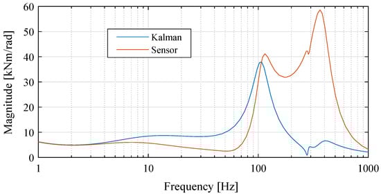 The gain of the controller in the range of the blade frequencies according to Figure 3 is significantly lower for the system that uses the Kalman coordinates than for the system that uses the sensor variables directly. Because of this low gain, a stable levitation is possible in the desired speed range. The gain plot of the Kalman-based system is strongly affected by the weighting matrices of the Riccati equation. Therefore, a good choice of these matrices is necessary for an acceptable running behavior of the rotor. The weighting matrix of the process error and the weighting matrix of the sensor noise are chosen as diagonal matrices. The entries must not be too high to have a suitable gain in the frequency range of the blade frequencies. In this paper, the diagonal weighting matrices are chosen as follows: