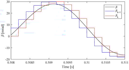 For the realization of the controller, a digital Kalman filter is implemented. In order to increase the damping of the digital Kalman-based system, the predicted states can be used in some operating ranges. The switch between the sensor coordinates and the predicted states of the Kalman observer are illustrated in Figure 6 at the input of the decentralized PID controller. Figure 8 shows the positive phase shift of the predicted angle (blue line) to the real angle (black line).
