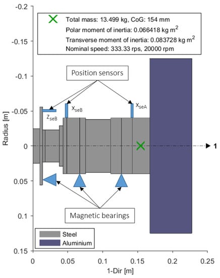 This section shows some experimental results for an industrial system to prove the functionality of the designed control structure. The controller was implemented on a digital signal processor (TMS320DM335) of a state of the art hardware for magnetic bearings. The geometry of the levitated rotor can be seen in Figure 9. The blade wheel is illustrated using the aluminum part (violet part). For the dynamic simulation, the blade wheel was modeled as a rigid part and was fixed on the flexible rotor using a flexible coupling.