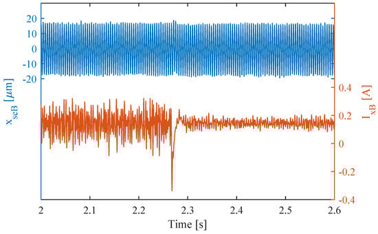 In order to compare the running behavior of the rotor for the estimated tilting coordinates and the sampled coordinates of the sensor signals, the system was investigated around a switching point. The switching point is the time where the input of the controller is changed from the sampled sensor coordinates to the estimated coordinates of the Kalman observer. Figure 10 shows the signal of the position sensor and the current .