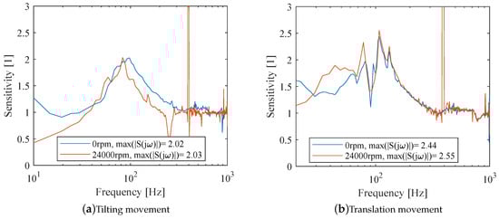 where FFT means the “fast-Fourier-transformation” of a signal. For an MIMO-system, the sensitivity function becomes a sensitivity matrix. However, according to ISO 14839-3, only the diagonal element of the sensitivity is necessary for the evaluation of the stability. To get a stability measure, the highest peak of the sensitivity function was used. For newly-commissioned magnetically-levitated rotors, the highest peak has to be below a gain of 3 (). The highest peak of the sensitivity function describes the closest distance to the Nyquist point. This closest distance to the Nyquist point implies also limits in the gain and phase margin []. For the evaluation of the sensitivity functions, the COG coordinates were used instead of the sensor and bearing coordinates. For these coordinates, the sensitivity function can be separated into two tilting, two translation and one axial sensitivity functions. The impact of the gyroscopic effect should only be present in the tilting sensitivity functions. Because the axial movement was a simple SISO-system, only the sensitivity functions of the tilting and translation movements are shown (Figure 11).