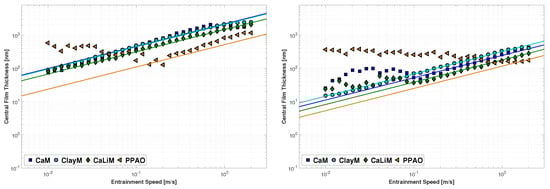 - Cann, P.M.; Spikes, H.A. Film thickness measurements of lubricating greases under normally starved conditions. NLGI Spokesm. 1992, 56, 21–27. [Google Scholar]