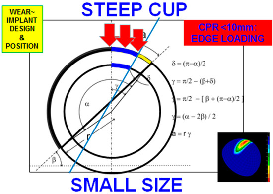 In 2005, Willert et al. published the first report on adverse tissue reactions to MoM hip arthroplasties, including 16 cases of 28 mm-diameter Metasul® bearings [14]. In 2008, the first paper on ‘Pseudotumours associated with Metal-on-Metal Hip Resurfacing’ from the Oxford group appeared [15] followed by many anecdotal reports on elevated metal ions, metallosis and soft tissue reactions from other centres [16]. In August 2010, the ASR (Articular Surface Replacement) MoM hip resurfacing and ASR-XL MoM THA (DePuy Orthopaedics, Warsaw, IN, USA) were recalled from the market for higher early revision rates due to adverse local tissue reactions (ALTR) to metal debris [17]. In the last decade, it has become apparent that design features including clearance and even more importantly the subtended articular arc (coverage angle) [18,19] (Figure 4) are crucial factors in the articular wear characteristics of MoM hip devices. In MoM hip arthroplasty, an important factor influencing the lubrication is the clearance, which is the difference in radius (radial clearance) or in diameter (diametrical clearance) between the acetabular and the femoral bearing surfaces [20]. (Figure 5). When the clearance is too large, the contact area between the femoral head and the acetabular cup during loading will be small (polar loading), which leads to high contact stresses and increased wear. When the clearance is too small, equatorial contact may occur during loading and both components will be jammed together, which also leads to increased wear (equatorial loading). In the ideal situation, a small wedge exists between the acetabular and femoral component via which a fluid film will be entrained during motion. Modern MoM hip arthroplasty designs and manufacturing have minimized the clearance problem by refining component geometry and reducing the tolerances, but with excessive wear e.g., at the edge, the altered clearance may become an additional factor accelerating implant failure [20]. The most important factor contributing to failure of modern MoM implants has been the coverage angle: a smaller subtended articular arc leads to a smaller contact patch to rim distance (CPR) (the distance between the point of intersection of the hip reaction force with the cup and the closest point on the inner side of the cup rim) [21]). A CPR < 10 mm leads to edge loading with higher wear [18,19,21] (Figure 6) and occurs more frequently with smaller femoral head sizes and when the acetabular component is placed at a higher inclination angle or at an inadequate anteversion angle [18]. This problem was most pronounced with the ASR designs exhibiting very low coverage angles but also with the smaller sizes of the BHR (Birmingham Hip Resurfacing, Smith&Nephew, London, UK) which had a smaller coverage angle and were more at risk for edge loading and increased wear, especially when not placed in the ideal position (Figure 7) [21,22]. Wear-related ALTR, as a result of innate macrophage-dominated immunological reactions to excessive wear debris (in casu metal particles) thus occurred more frequently with smaller sizes [23,24,25], in diagnoses associated with difficult surgical reconstruction because of anatomical anomalies such as developmental dysplasia of the hip (DDH) and post-traumatic osteoarthritis [23,24,25] and in the hands of less experienced surgeons with a suboptimal surgical technique leading to inadequate component positioning [23,24,26,27]. Females are more at risk for ALTR because of all the aforementioned reasons including smaller size, more frequent diagnosis of DDH, and higher anatomical hip anteversion [20,21,22]. Additionally, women seem to be more prone to metal allergy; cases of ALTR not related to excessive wear but to adaptive immunological reactions to metal particles occurring more often in females [23,24,28]. It needs to be emphasized that the generation of metal particles is not an exclusive characteristic of MoM hip arthroplasty. In wear simulator studies with total knee arthroplasties (TKA), Kretzer et al. have demonstrated that 12% (in weight) of the wear products generated in these metal-on-polyethylene articulations were metallic purely related to wear and without measuring additional soluble metal ion generation by corrosion [29].