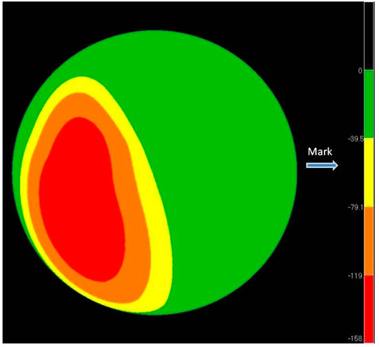 Retrieval of high wear Birmingham Hip Resurfacing (BHR) HRA, head size 52 mm, implanted in a 59-year-old male with primary osteoarthritis. This was revised after 58 months for cup malpositioning (EBRA measurement inclination 57°; anteversion 51°) associated with very high metal ions (Cr: 25.1 µg/L; Co 72.4 µg/L) and a soft tissue mass. This coordinate measuring machine derived wear depth map shows high wear due to edge loading, (maximum 158 microns).