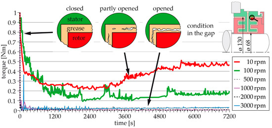 - Grease distribution run to ensure a opened gap; shaft speed is n = 500 rpm;