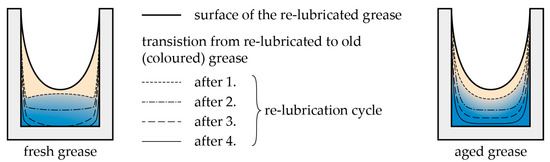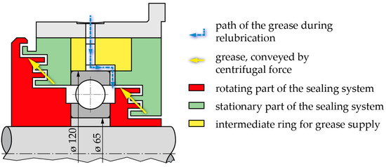- Bosch, F.; Haas, W. Relubrication of Grease-Filled Labyrinth Sealing Systems. Konstruktion 2016, 68, 78–82. (In German) [Google Scholar]