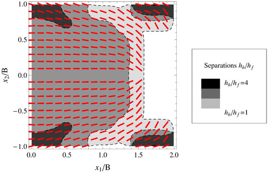 One of the proposed optimal texture geometries, calculated by adopting a multigrid optimization procedure based on a genetic algorithm, is depicted in Figure 2 for the square pad geometry. In the figure, the red stripes show the local angular alignment of the grooves. The number of the stripes, which have been drawn in the Figure 2, have only a qualitative purpose, i.e., they do not represent the lattice spacing and the dimensions of the defects, nor have they been somehow scaled. They only represent the areas where the dimples are located over the squared pad, as well as their orientation. We observe that the microgrooves have been aligned in such a way to hinder the flow of the lubricant towards the lateral direction, thus preventing any immediate leakage and, hence, friction increase. Furthermore, the stripes inclination close to the lateral boundaries enables the redirecting of the fluid, at a scale larger than the scale of the grooves, towards the internal portion of the domain, through a micro-herringbone construction. This determines a large number of fluid particles sheared at the contact interface and, consequently, an increase in the bearing pressure.