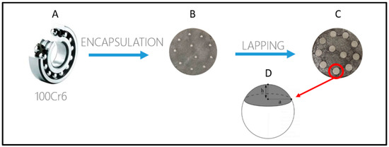 Steps in the sample preparation. (A) 100Cr6 balls are extracted from commercially available ball bearings, and subsequently (B) encapsulated in a resin matrix holder. (C) The resin holder is introduced in a lapping machine where the holder (and the spheres) is abraded until a defined penetration is reached. The lapping ends with a mirror finishing process. (D) After the subsequent laser micromachining process, the resin matrix is gently fragmented and the truncated microtextured spheres are recovered for the further tribological assessment.