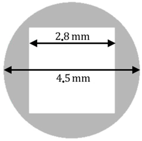 Three of the circular truncated surfaces, obtained with the procedure described in Section 3.1, were laser-machined as follows. The grey area in Figure 4 of the circular sample outside an about 2.8-mm-side square was removed by femtosecond laser milling reaching a depth of more than 100 μm, which is an order of magnitude higher than the expected average fluid thickness under the bearing. We have used one of the milled samples as a flat control squared pad. The other two samples were further laser machined.