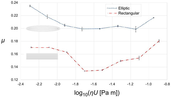 The comparison of the tribological behavior of the textured pads with elliptical and rectangular dimples at different sliding speeds is represented in Figure 8. From the Stribeck curves, both obtained by maintaining a constant temperature of 20 °C and applying a load of 1 N, the three lubrication regimes can be easily recognized. At sliding speeds slower than 0.03 m/s, the measured friction coefficient is relatively high, typical of the boundary lubrication.