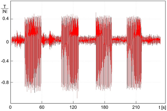 The textured sample results shown in Figure 11 reveal, instead, a substantial asymmetry of the oscillation amplitudes. Here, the tangential force is twice as intense when the direction of rotation is opposite to that for which the texture pattern has been designed. The same measurement was repeated for four different time intervals, obtaining similar behaviors and thus proving confidence in the results and supporting the existence of the micro-hydrodynamic collective contribution originated by the anisotropic surface microstructures.