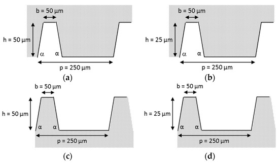 Side schematics of the geometries of the negative micro-grooved structures to be produced on injection molds: (a) structure 1; (b) structure 2; and the resulting micro-ridged surface structures to be produced on Liquid Silicone Rubber (LSR): (c) structure 1; (d) structure 2 (only 1 period shown in each schematic).