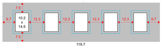 Position and dimensions of the upper casing apertures projected on the lower steel plate (apertures shown in white and theirs borders as black lines) along with position and dimensions of the 5 small sections to be structured on the lower steel plate (shown as dashed blue lines).