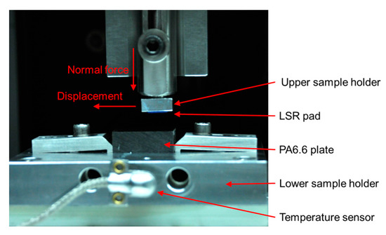 In order to evaluate the influence of a reduction of the effective contact area of elastomers through laser texturing on their friction behavior, stepwise load increasing friction tests were performed using a RVM-tribometer (RVM1000, Werner Stehr Tribologie, Horb-Ahldorf, Germany). A LSR pad was used as upper specimen and the lower specimen was either an Al-6082 (denominated as Al throughout the rest of the manuscript; Alcan Technology & Management AG, Neuhausen, Switzerland) or a PA6.6-GF30 plate (denominated as PA throughout the rest of the manuscript; faigle Industrieplast GmbH, Hard, Austria), having dimensions of about 20 by 25 mm and a thickness of 3 mm (Al) or 6 mm (PA) and roughness values of approximately Ra = 0.5 μm and Rz = 3.0 μm for both plate materials. The LSR pad was placed in a special sample holder, which enabled an adequate 2D-alignment of its contact surface with the surface of the underlying plate, the latter being fixed to the tribometer. The LSR pad was pressed against the chosen plate with the first pre-determined load value and moved in a linear movement at pre-determined speed and distance. In order to allow time for the pads to relax themselves and to be fully in contact with the counter plate (Al or PA), the pad was set in movement only 2 s after the normal force was applied. The test was then repeated for the second pre-determined load value and further on, thus the name of stepwise load increasing friction tests. For each normal force value, only 1 friction test was performed, therefore, no statistical evaluation of the obtained friction results may be performed. This whole testing was performed for both micro-structures and also for the benchmark against both plates (Al or PA). The parameters used for all friction tests are summarized in Table 4 and Figure 5 shows a detailed view of the setup.
