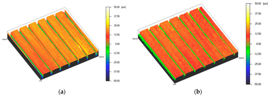 A detailed topographical analysis of both micro-grooved structures produced on injection molds is shown in Figure 7. The measurements of the dimensions of the micro-structures have shown that the micro-grooved structures produced on the injection molds using the ultra-short pulse laser possess the initial desired dimensions, as listed in Table 5. These results show that the production of micro-grooved structures on the surface of injection molds made of steel 1.4301 can be accurately manufactured. However, the attainment of structures possessing the desired dimensions is not a one-shot process; optimization steps are previously necessary for any new material in order to adjust the different laser parameters in order to obtain the width and depth of the desired structures. Therefore, the actual optimized laser parameters found for molds made of steel 1.4301 used in the present study may not be used for molds made from any other steels.
