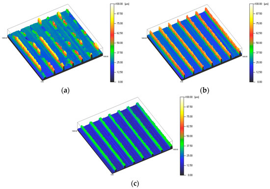 A detailed topographical analysis of both micro-ridged structures produced on LSR pads is shown in Figure 8. First of all for structure 1, it was observed that 2 LSR pads (out of 5 pads) had some surface areas with defects, i.e., the micro-ridges were not properly fabricated. It was observed that micro-ridges were either not present or did not have the desired geometry or dimensions. A typical surface topography of such regions having surface structure defects for structure 1 is shown in Figure 8a. At this stage of the present study, it is not yet known if these problematic surface areas are due to the fact that LSR did not fill properly some micro-grooves of the injection mold due to the higher depth value of 50 μm or if the micro-ridges on the surface of LSR pads were torn apart from the pad surface during the unmolding step. However, quick visual observations of the surfaces of the injection mold after the injection process did not reveal any traces of LSR trapped in the micro-grooves of the mold. Therefore, based on these visual observations, it is believed that the presence of defect zones on some LSR pads with structure 1 may be due to the fact that a micro-groove depth of 50 μm was probably on the edge of being too deep for the given viscosity of LSR, which impaired a complete filling of the mold’s micro-grooves during the injection molding process. However, the exact cause of these defect zones was not further analyzed, since, as mentioned previously, an optimization of the molding process is not part of the present study.