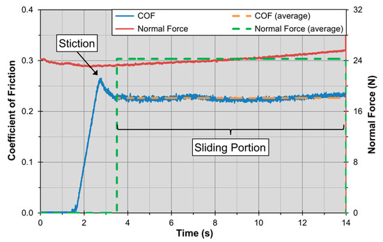 Typical curve showing the normal force (red) and friction coefficient (coefficient of friction (COF) blue) measured by the tribometer and the corresponding post-analysis values: average of normal force (dashed green) and average of friction coefficient (COF dashed orange) in the sliding portion of the curve along with the stiction value (curve obtained from structure 2 against PA for a normal force of 25 N).