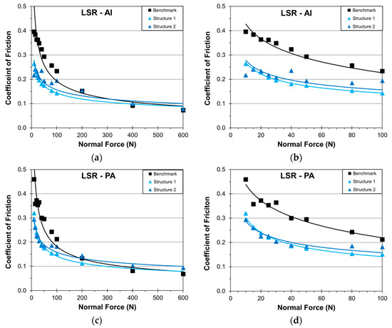 The sliding friction coefficient results of the stepwise load increasing friction tests for the benchmark (unstructured) and of the structured LSR pads (micro-ridged structures 1 and 2) are shown together in Figure 10a,b against Al and in Figure 10c,d against PA. Each point represents the calculated average of the friction coefficient (calculated from the sliding section of the obtained curve as shown in Figure 9) for the specified applied normal force. In all diagrams shown in Figure 10, trend lines (based on a power function) were added in order to help the reader to obtain a quick visual overview of the load dependency of the friction coefficient for each studied surface structures in comparison to the benchmark. The use of such power function trend lines has no physical reason and should not be used as a phenomenological description of the load dependency of the friction force or friction coefficient; these trend lines were chosen only to enhance the visual clarity of the diagrams shown.