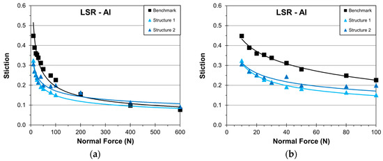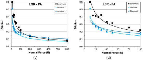 The stiction results of the stepwise load increasing friction tests for the benchmark (unstructured) and for the structured LSR pads (micro-ridged structures 1 and 2) are shown together in Figure 11a,b against Al and in Figure 11c,d against PA. As for diagrams showing results of the sliding friction coefficient (Figure 10), in all diagrams shown in Figure 11, trend lines (based on a power function) were added in order to help the reader to obtain a quick visual overview of the load dependency of the friction coefficient for each studied surface micro-structures in comparison to the benchmark.