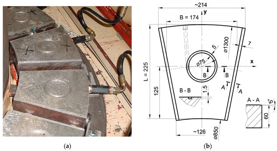 Basic specifications of the thrust bearing are listed in Table 1. Bearing pad dimensions are shown in Figure 1b. The pad is made of mild steel and lined with a high-tin bearing alloy, the sliding surface roughness is Ra 0.2 µm, and the tolerance of planarity is 0.01 mm.