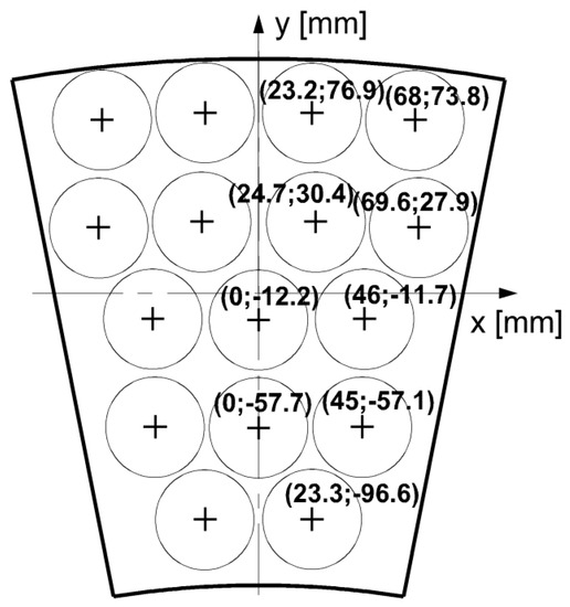 A special instrumented pad was installed in each of the two tested machines. Instrumentation built into the bearing pads was composed of 16 thermocouples and three eddy-current proximity probes. Thermocouples were arranged in pairs (1 and 2; 3 and 4; 7 and 8; etc.). One thermocouple of each pair was situated in the vicinity of the sliding surface, just below the Babbitt layer and the other near the bottom of the pad, 5 or 6 mm from the pad back. Copper-Constantan thermocouples (Type T, Cu-CuNi) of 2 mm diameter were used. Thermocouples in a PTFE liner were installed in 2 mm holes drilled in the bearing pad. No special calibration of the thermocouples was carried out and the temperature was evaluated with the use of the standard coefficient for T-type thermocouples provided by their manufacturer. According to thermocouples manufacturer’s specification possible error of temperature measurement is 0.5 °C. On the basis of measured temperatures the temperature at the surface was evaluated with the use of linear extrapolation—for example, TA was calculated on the basis of T1 and T2 (see Figure 3). Three proximity probes (p1, p2, p3) were fixed to the sides of the pad with the intention of measuring the pad position with respect to the collar. Their distribution is shown in Figure 3 and the coordinates are shown in Table 2 and Table 3.