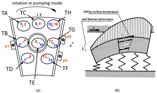(a) Distribution of the thermocouples (1–16) and proximity probes (p1–p3) in the instrumentation pad (thermocouples marked with red are situated close to the sliding surface, and those marked with blue are close to the pad back), TA-TH designation of surface temperature; and (b) thermal deformation of the pad and illustration of the evaluation of surface temperature on the basis of the linear extrapolation of the measurement results.