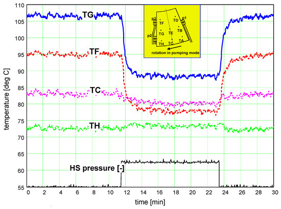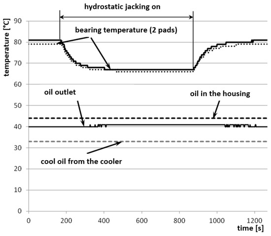 Similar experimental evidence of differences in losses in hydrodynamic and hybrid modes was also observed in the research described in this paper. Due to the operation of an external cooling system with a volumetric pump and measurement of temperatures of the oil drained from the oil bath and the oil supplied back to the bearing and the losses in the bearing can be estimated on the basis of heat balance—in contrast to the calculations described above, in this case estimated losses comprise the total loss in a thrust and radial bearing, including losses due to mixing of the oil in the bearing housing. Other components of the heat balance, e.g., convection at the external walls of the housing, were assessed as negligible. The graph at Figure 10 shows the data acquired during the test run during the pumping mode with the high-pressure pump switched on for approximately 15 min. It was the same test run as shown in Figure 4, but data from different sensors are shown here—temperatures are measured by the sensors installed in the middle of the pad. The temperature of the oil drained from the housing increased by 1 °C from 40 to 41 °C 3.5 min after switching on the hydrostatic jacking system, while the temperature of the oil supplied to the oil bath was equal to 32 °C and did not change. The losses are equal to 245 and 280 kW, respectively, for hydrodynamic and hybrid operation, according to the formula: