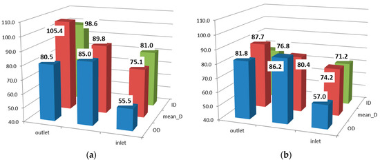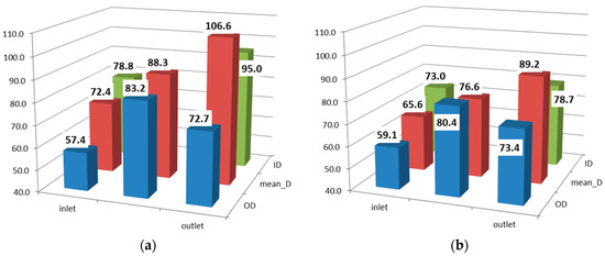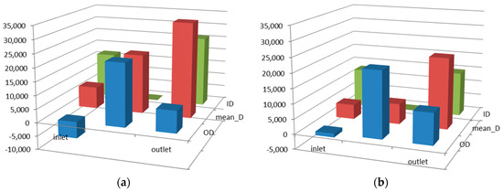 The distribution of the temperature at the pad surface in selected locations (TA–TH—see Figure 3) are shown in Figure 5 and Figure 6. The results are based on linear extrapolation of measured temperatures as explained in Figure 3. Temperatures in the generating mode are shown in Figure 5, with standard hydrodynamic operation in Figure 5a, and hybrid operation, with the hydrostatic pump switched on in steady-state mode in Figure 5b. Results of the pumping mode in hydrodynamic and hybrid regimes are shown in the same manner in Figure 6. One can see distinct differences between both regimes. In the hydrodynamic regime there is an increase of temperature along the film from the inlet to the outlet, most clearly seen at the mean diameter (red bars)—the increase is equal to 30 °C in the generating mode and 34 °C in the pumping mode. In comparison, in the hybrid regime the temperature rise is equal to only 13 and 24 °C, for generating and pumping, respectively. Higher maximum temperature and temperature rise in the pumping mode are probably the result of higher axial load, but exact data are not known. Due to lower temperature at the surface, the pad in the hybrid regime is less deformed. On the basis of similar measurements in the same bearing, which were published in [15], the pad thermal deformations were assessed as 15–25 µm in various modes of transient operation, in the steady state they are probably close to 15 µm. It is also likely that the film is thicker in hybrid mode—this is only indirectly known from comparisons of the film thickness in transient states [15]. Altogether the temperature in the hybrid regime is lower, by 7–7.3 °C, but the temperature at the outer radius is higher for the hybrid mode, which may be the result of the larger radial inclination of the pad and smaller thermal deformation. Another interesting observation is the lower inlet temperature of the pad in hybrid mode, the difference is approximately 3–3.6 °C in both modes, and this is the result of lower surface temperature (and most probably also the film temperature). The runner temperature is also likely to be lower due to cooler film and better heat exchange.