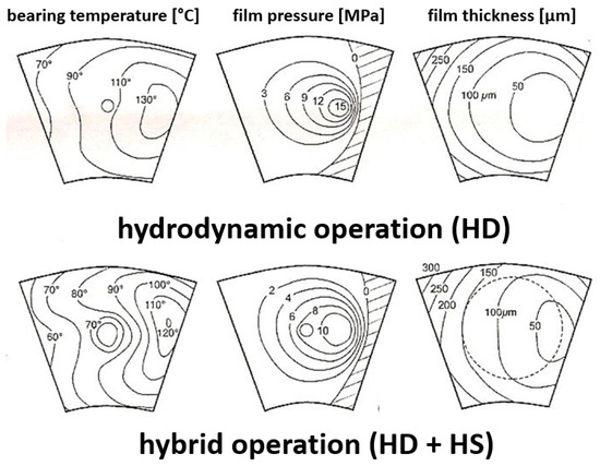 Ettles et al. [10] presented the study of the hydrostatically-assisted start-up of a hydraulic machine. Figure 9 shows the results of calculations of temperature distribution, film pressure, and film profile performed for a bearing of OD = 2 m, ID = 1 m, at 500 rpm, for both hydrodynamic operation (the upper graphs) and hybrid operation (the lower graphs). One can see that the film is thicker and the temperature is significantly lower in hybrid operation. With the use of the presented graphs it is possible to assess the friction losses in the film in both modes of operation by dividing the pad area into smaller parts. Then it is possible to identify the average local film thickness, local temperature and, on this basis, also local viscosity [17]. According to such calculation, the friction losses in the film (per whole bearing) is equal to 236 kW in a hydrodynamic bearing and 292 kW (24% increase) in a bearing in a hybrid mode. The result shows that the benefit of larger thickness and lower shearing rate was not sufficient to compensate the effect of lower temperature and increased viscosity. On the other hand, due to the increase of the film thickness, the increase of losses is smaller than the increase of viscosity (44%) at the average temperature, which is about 15 °C lower in HD mode than in hybrid mode. Further calculations show that if the film had been approximately 25 µm thicker, the effect of the increased viscosity would have been compensated. The above results are only a comparison of shearing losses in the film. It has to be pointed out that running in hybrid mode requires operation of a high-pressure oil pump, with additional energy consumption.