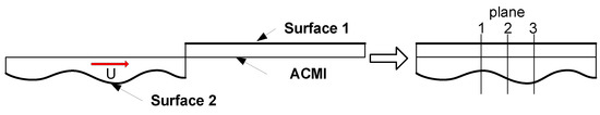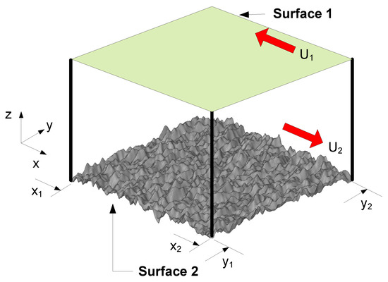 The two sliding surfaces 1 and 2 exhibit local height changes and , which are measured from the mean level of each surface. Figure 1 is showing a 2D cross section through the 3D geometry with geometric definitions and visualization of the flow rate calculation. Pressure and velocity boundary conditions are described in Section 3.2. In the lubrication gap generated from these two surfaces, the nominal gap height , is defined as the difference between the mean levels of the two surfaces and :