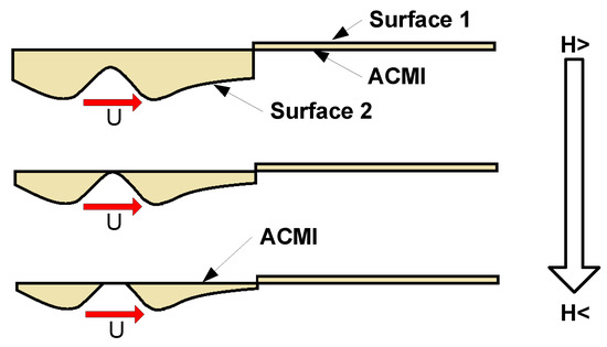In this case the simulation was carried out by a “Moving Mesh”. The control volume was split in half so that each surface got assigned a fluid mesh (see Figure 4). Interaction between both mesh areas took place by using the OpenFOAM-boundary condition arbitrary coupled mesh interface (ACMI), which allows the interpolation of pressure and velocity data. The other boundary conditions were the same as described in Section 3.2.