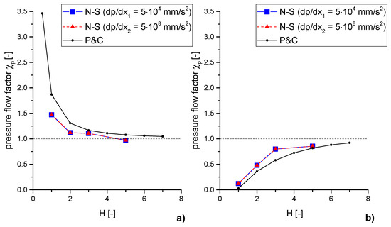 The results show the same trend as the curves according to Patir & Cheng (see Figure 6). When the surface structures are oriented along the flow direction, the flow factor is greater than 1, which means the volume flow in the rough lubricating gap is greater than in the perfectly smooth gap. It can be observed that the flow factor does not depend on the pressure gradient. This is due to the laminar flow regime (valid for the smaller and the larger pressure gradient) as well as the relatively smooth surface topography. A dependency on the pressure flow gradient may arise with stronger topography variation, like surface texturing [31,32]. Furthermore, the numerical simulation with the Navier-Stokes equations shows a more conservative behavior of the flow factors, which means that the roughness shows less influence on the flow behavior.