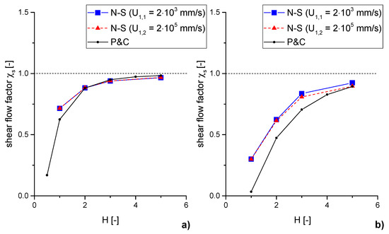 The shear flow factors (see Figure 7) were also calculated for two different relative velocities ( mm/s and mm/s). As moving surface the smooth one was chosen. The simulation was carried out by a “Mapping” of the wall velocity on the fluid velocity.